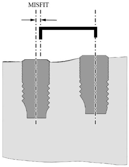 Figure 1 reports a scheme to define a misfit condition. In this specific case, the bar is assumed to be shorter than the gap between the two implants and the only misfit occurring is a translational gap along the line that joins the central position of the two implants [12,21].