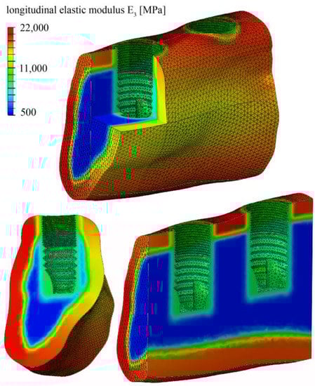 Bone material properties must be characterized depending on the different phases of the interaction occurring between implant and bone. In the present investigation, the biomechanical effects of the press-fit process are not considered. The starting point for the analysis carried out is the condition where the implant finds its location on the basis of a standard surgical procedure, while the specific aspects of press-fit are not discussed while reference is given for research works in the literature [28,29]. The elastic phase of cortical and trabecular bone is characterized by the anisotropic configuration of the tissue, distributed along three orthogonal axes, as orthotropic conformation. This represents a form of optimization for the response of the tissue to different conditions. This entails relevant problems in the definition of the constants that characterize the behavior of the bone material and determines a considerable effort in its representation within the numerical model. In Figure 2, a representation is proposed for one of the nine fundamental parameters requested at each point for the definition of an orthotropic model. The cortical region shows a transition to the trabecular portion, recalling that all these data depend on the acquisition through an accurate experimental investigation. Particular attention must be paid to the peri-implant bone tissue, according to the fact that the properties vary depending on osteointegration process. In fact, these figures interpret the condition when osteointegration took place and it consequently follows the insertion of the implant.