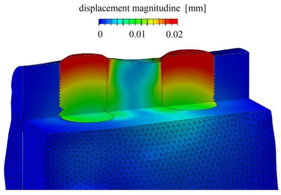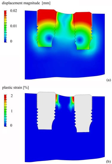 In Figure 1, the basic configuration of the misfit is provided, while Figure 2 reports the anisotropic distribution of material properties. The identification of the orthotropic elastic constants results from the interpolation of data from experimentations on human cadaveric jaws, while the orthotropic directions are defined on the basis of both experimental results and local bone morphometry [37]. Figure 3 represents an overview of displacement magnitude and plastic strain induced by translational misfit on the implants. The manufacturing inaccuracy is assumed along the distal–mesial direction.