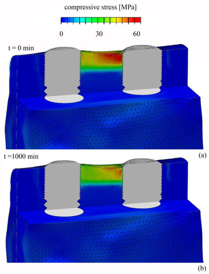 Numerical analysis. Compressive stress on the mandible at the application of the misfit (a) and at the end of the relaxation process (b).