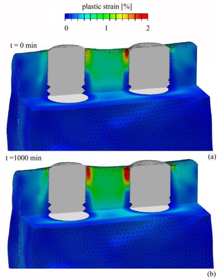 Figure 4 reports a detail of displacement distribution within the mandible and implants because of misfit application. In Figure 5 and Figure 6, the scheme of time-dependent response in terms of stress relaxation is proposed, considering the variation in time. In fact, the stress induced by the coupling of implants with the connecting bar shows a decreasing intensity in time depending on the so-called relaxation process (Figure 5). Bone time-dependent phenomena must be carefully considered, evaluating the effects in time of stress (Figure 5) and permanent deformation (Figure 6). The time gap assumed is of the order of 1000 min to cover the full range of the process, with a large margin, as the process usually arrives to a final configuration in a shorter time.