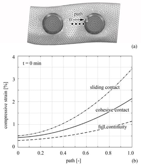 In Figure 7, the upper view of the mandible region in the numerical model is reported, with the indication of the strain path along the inter-implant distance. Along this path, strain distributions are reported for the three different conditions at the application of the misfit. In detail, three conditions of bone–implant interface are analyzed, such as full continuity, cohesive contact and sliding contact. The former conditions represent a fully and a partially osteo-integrated situation, respectively, while the sliding contact describes the structural response when the coupling bar is applied immediately after implant placement.