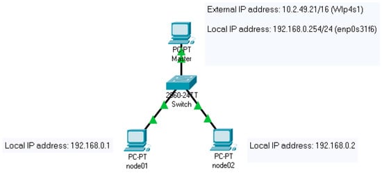 An HPCC is a type of distributed computing system that consists of multiple computers or multiple nodes connected through a local area network (LAN), commonly with ethernet technology. There are several network interconnection options for clusters such as ethernet, FastEthernet, and GigabitEthernet (some examples of interconnected technologies used in HPC include InfiniBand and Myrinet) []. An ethernet network can be interconnected by devices that enable Gbit ethernet bandwidth speeds. For this article, the master node, for example, had two network interface cards (NICs), one wireless (wlp4s1) and one wired (enp0s31f6). The other three computing nodes also had two cards, but it was only essential to use the wired one (enp0s31f6). All the computers were connected to a CISCO 2960 switch, which allowed connecting the interfaces with Gbit ethernet width (high-speed ethernet). Figure 2 shows the network diagram and the IP addressing table of the proposed HPCC infrastructure.