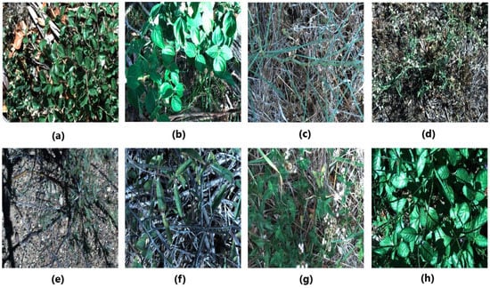 Samples of the images contained in the dataset “DeepWeeds”: (a) Chinee apple, (b) Lantana, (c) Parkinsonia, (d) Parthenium, (e) prickly acacia, (f) rubber vine, (g) Siam weed, and (h) snakeweed [].