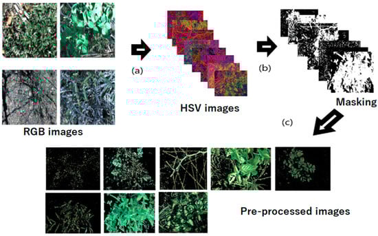 where Max is the maximum value of the RGB color model components, Min is the minimum value of those same components, and mod is a modular operation with 360 degrees. Figure 5 represents the process of the color conversion and masking of the preprocessed images.