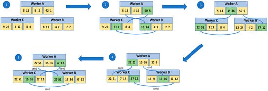 The Horovod Allreduce uses a combination of MPI and NCCL to optimize communication and computation for training DL models. By leveraging these libraries, the Horovod Allreduce can efficiently scale up to thousands of CPUs or GPUs, reducing the training times and improving performance. In this algorithm, each N nodes communicate with two of their peers 2 × (N − 1) times. During communication, a node sends and receives some buffered data frames. In the first iteration (N − 1), it receives values that are added to the node’s buffer values. In the second iteration, the received values maintained by the node buffer are replaced []. Figure 6 shows the process in which the gradients are calculated using the Allreduce algorithm.
