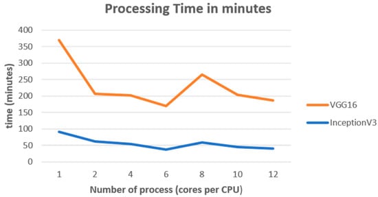 An interesting finding was that applying six processes in the HPCC resulted in the best time for both CNN models. Loading and distributing two processes as a parameter in each node, we were able to utilize 50% of the processor capacity in each computing node. This trend suggests that utilizing eight processes in an HPCC with additional computing nodes could yield even better processing times.