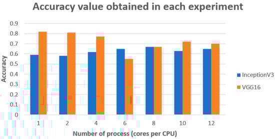 In Table 6, we can see the results obtained by applying four processes to perform the distributed DL in the workstation and the HPCC. As mentioned above, the value of four was used as a benchmark because in the experiments where more than four processes were applied to the workstation, its memory overflowed. Therefore, at least in the HPCC, it was possible to take advantage of the twelve processes in total that were available for processing. Even so, it can be noted that the InceptionV3 model had a higher accuracy but less processing time, while the VGG16 model had a better processing time but lower accuracy.