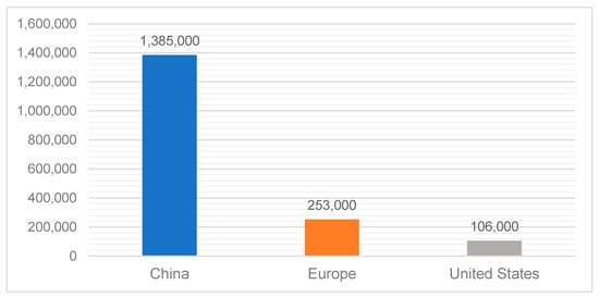 In this regard, government incentives play a critical role in increasing the sales of electric vehicles by making them more affordable and accessible to the public [17]. China is a prime example of this, as the government has implemented various policies and incentives to encourage the adoption of electric vehicles. These include financial incentives such as subsidies, tax breaks, and free license plates, as well as non-financial incentives such as preferential access to carpool lanes and free parking [39,40,41]. These incentives have helped to reduce the upfront cost of electric vehicles, making them more competitive with traditional gasoline-powered cars. In addition, government investments in charging infrastructure and research and development have helped to address concerns around range anxiety and the technology’s reliability. These incentives have resulted in a surge in electric vehicle sales in China, making it the largest market for electric vehicles globally [39,42]. Figure 2 depicts the global electric car stock country-wise, including battery electric vehicles (BEVs) and plug-in hybrid electric vehicles (PHEVs). China also holds the largest number of public EV charging stations, as shown in Figure 3.