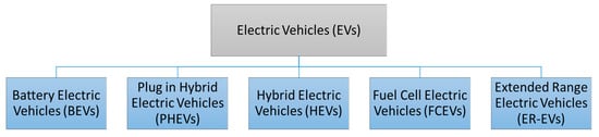 Vehicles that operate on electricity rather than petrol or diesel fuel are known as electric vehicles (EVs). There are several EV kinds, each with a unique engine and settings [44]. According to their engine technology and settings, electric cars are categorized in the following manner in detail (Figure 4):