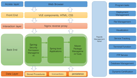 The entire system is divided into five software-level layers, which are, from the bottom to the top, the basic data layer, the back-end, the interaction layer, the front-end, and the access layer. The data layer serves as the persistence support for the whole system, providing relevant data to external services through connection pools. Specifically, it contains relevant stored procedures and predefined transactions. The back-end mainly uses the Spring Security framework to classify access to requests and deploy the Spring application on the server to manipulate various types of data. The interaction layer mainly uses the Nginx server to handle the upper application requests. It accesses the back-end server through interface-routing hops according to the configuration file format to achieve load balancing [37]. The front-end is mainly the display part of the page, developed by Hyper Text Markup Language (HTML), Cascading Style Sheets (CSS) for page rendering, and finally integrated by the Vue front-end tool. The access layer is how users access the resource platform using tools such as browsers. The system uses a front-end and back-end deployment approach, with the front-end using the Vue framework and the back-end using the Spring Boot framework for development [38,39] through the Maven packaging tool for deployment. The data storage uses the MySQL database to store project details and teacher account information for the subsequent release of shared resources. The Spring Security framework is used for the security verification of the website and user authentication. The front- and back-end separation architecture of the system is shown in Figure 1.