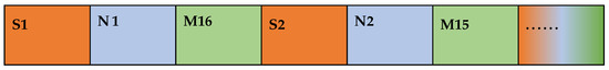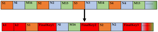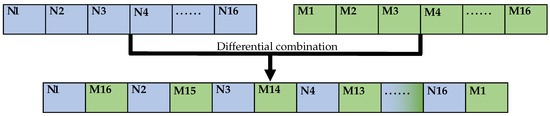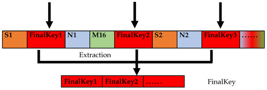 The extraction starts from the 2nd bit of FinalSTR, where the extraction interval is 2 bits, the extraction count is , and the component MD5 value is defined as leftM. After the extraction count is finished, the extraction starts from the position of one bit after the last extraction position interval. Additionally, the extraction interval is one bit in this stage of the extraction process until the extraction reaches the end of the data sequence FinalSTR to acquire part of the MD5 value as rightM. The sequential combination of leftM and rightM is defined as tmpM. The operation flow is shown in Figure 8.