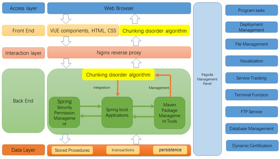 The resource platform system contains a large number of resources and stores user login credentials. The back-end utilizes Spring Boot for data calls and a MySQL database for data storage. User identification and rights management are implemented using Spring Security. The chunking algorithm is packaged as a jar file and deployed in the back-end, where it can be invoked through the Maven management tool. This approach enables the easy and efficient invocation of the chunking algorithm on a highly scalable platform. The entire platform is deployed on an Nginx server, and the environment is monitored using the Pagoda O&M management tool, which enhances the reliability of the resource platform. Ultimately, the server provides an interface to the front-end for relevant invocations. The deployment of the chunking algorithm in the resource platform system dramatically enhances the security of the data transmitted through the platform. The use of jar packages allows the chunking algorithm to be easily and quickly integrated into the system, thus increasing the scalability of the system. In addition, the chunked disorder algorithm can support data encryption scenarios for most functions of the resource platform system, including the encrypted transmission of data such as usernames, passwords, and text resources, further improving the system’s security. Ultimately, the architecture design of the system and the deployment method of the chunked chaotic algorithm fully consider the scalability and security requirements of the system, providing users with a more secure and reliable resource platform service.