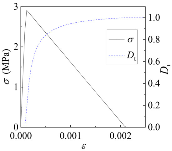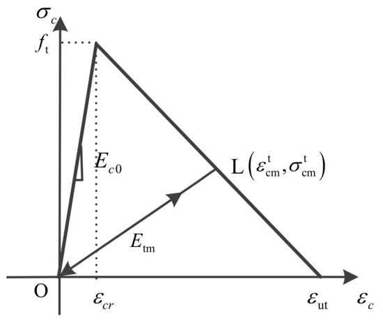 The tensile skeleton curve in the model is shown in Figure 3. is the maximum tensile stress; is the strain corresponding to the maximum tensile stress; is the initial tangent module; and is the ultimate tensile strain.