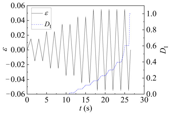 Pirondi and Bonora [29] modified the Bonora damage model to accommodate the cyclic loading. In the model, the steel bar is considered damaged only when it is subjected to tension. Therefore, only the tensile plastic strain is adopted when calculating the damage index. The stress–strain curve of the modified Menegotto–Pinto model considering damage is shown in Figure 5, and the corresponding damage index is shown in Figure 6.