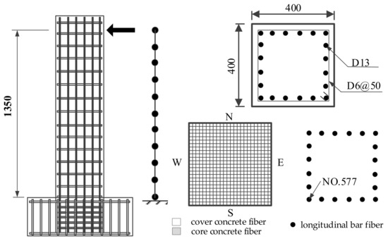 Nagaya and Kawashima [30] completed a series of quasi-static tests of reinforced concrete columns. In this paper, the specimen TP-29 was selected for simulation analysis. The effective height of the specimen was 1350 mm. The section size was 400 mm × 400 mm. The axial force was 150 kN. In the analysis model, specimen TP-29 was divided into ten fiber beam–column elements along with the height. Element division and section fiber discretization of specimen TP-29 are shown in Figure 7. The mechanical properties of the concrete material and the steel material are given in Table 1 and Table 2, respectively.