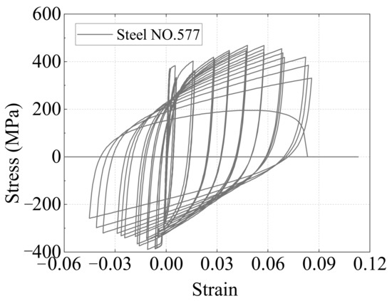 Figure 8 shows a comparison between the analytical and experimental force–displacement hysteretic curves of the specimen TP-29. The result showed that numerical simulation can predict the force–displacement hysteretic curves of the specimen TP-29 with good accuracy. The RSAPS platform can provide a precise prediction of the stiffness and strength degradation of the specimen TP-29 under cyclic loading. However, the unloading stiffness of the specimen in the simulation is larger than that in the experiment. The main reason may be that the bond-slip between concrete and steel bars reduced the overall stiffness of the specimen, which was not considered in the simulation model. In the analysis, the steel bar was severely damaged and fractured. The stress–strain relationship of the steel bar is shown in Figure 9.