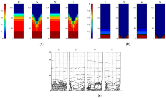 Figure 10 shows the final damage distribution of the specimen TP-29. The ordinate represents the height of the specimen. The simulated tensile cracks on each surface (tensile damage index reached 1) were mainly within 30 cm at the bottom of the specimen. Surface E and surface W were more seriously damaged. Surface N and surface S showed large damage for the edge and relatively small damage for the central region. The simulated compression failure of each surface (compression damage index reached 1) was mainly within 20 cm at the bottom of the specimen. Surface E and surface W were damaged more seriously. The compression failure of surface N and surface S was mainly concentrated at the bottom edge, showing a triangular distribution inside. Through comparison, it was found that the simulated damage distribution of the specimen was consistent with the test result, which verified the validity of the damage analysis model.