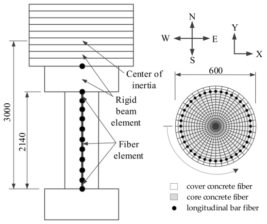 Investigation of seismic damage and experimental studies found [1,2,3] that the failure of reinforced concrete columns is often the main reason for the collapse of building structures. Damage analysis of reinforced concrete columns under earthquakes can provide an important basis for revealing the collapse mechanism of building structures. Currently, solid element models combined with the corresponding concrete material damage models [4,5,6,7,8] are usually used to analyze the damage of reinforced concrete members. However, due to the introduction of a large number of degrees of freedom, the computational cost is high, which makes the solid element model unsuitable for daily engineering applications. The fiber beam–column element model [9,10,11,12,13,14,15] can not only simulate the mechanical properties of components macroscopically, but also provide deep insights into the local nonlinear characteristics of components; it also has high computational efficiency. Therefore, it has become the most active and widely used analysis model in the field of refined simulation of the nonlinear behavior of reinforced concrete structures. However, if the fiber element model is used to analyze the damage of reinforced concrete members, it is particularly important to combine it with the damage model of concrete and steel materials.