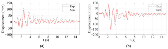 The displacement response is shown in Figure 15. Due to the increasing amplitude of ground motion, the displacement response of the specimen also increased greatly. At 2.58 s, the displacement in the X-direction reached a maximum value of 174.50 mm. At 2.71 s, the displacement in the Y-direction reached the peak value of −244.51 mm.