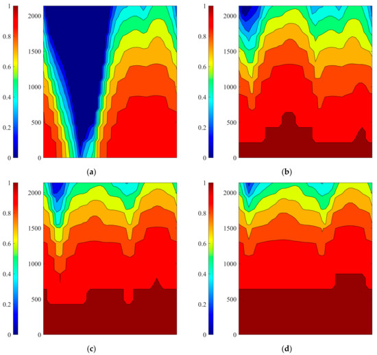 Figure 14 shows the final damage distribution of the specimen. The ordinate represents the height of the specimen. The simulated tensile cracks (tensile damage index reached 1) were found to be mainly within 700 mm at the bottom of the specimen, and the crack distribution was consistent with the experimental results. The simulated compressive failure (compressive damage index reached 1) was mainly within 250 mm at the bottom of the specimen. The compressive damage at the bottom edge was relatively small, which was consistent with the experimental results. The simulation results can show the failure parts of the specimen and the damage of the incomplete failure parts (damage index less than 1). The damage of the steel bars was found to be very small and no separate analysis was performed.