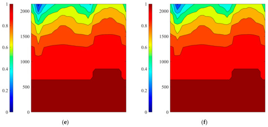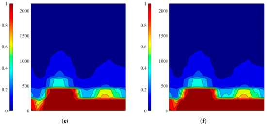 The compression damage of concrete. (a) At 1.05 s; (b) At 2.04 s; (c) At 2.58 s; (d) At 2.71 s; (e) At 5.43 s; (f) At 7.75 s.