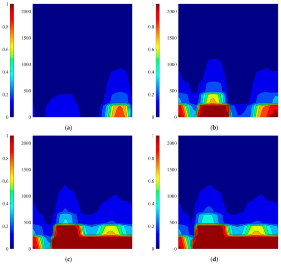 The tensile damage of concrete at different times is shown in Figure 16. The ordinate represents the height of the specimen. At 0.67 s, tensile damage occurred at all positions of the bottom of the specimen. The damage on the right side was greater than on the left side. The damage at the bottom of the specimen was the largest. At 1.10 s, the bottom of the specimen was fully damaged by tension. The height of the local damage reached 600 mm. At 2.04 s, the tensile failure occurred at a height of 500 mm at the bottom of the specimen. The most severe damage area changed from the middle lower part of the specimen to the right lower part. At 2.58 s, the displacement in the X-direction reached the maximum. Tensile failure occurred at a height of 600 mm at the bottom of the specimen. The height of tensile failure of the lower right part of the specimen reached 800 mm. At 2.71 s, the displacement in the Y-direction reached the maximum. The tensile failure range of the lower right part of the specimen increased slightly on both sides. The damage gradually developed to the upper part of the specimen. After that, although the specimen was still subjected to the earthquake, only the local tensile damage of the specimen increased slightly. At 7.75 s, the tensile damage of the specimen reached the final state. Although the ground motion continued, the damage did not continue to develop. At this time, the damage index in most areas of the specimen exceeded 0.5, and only a very small area at the top had less damage.
