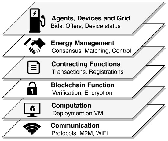 According to Desen et al. [19], the information is transmitted through six different layers in the energy smart contract workflow, as illustrated in Figure 1. The first layer involves the transmission of input data in the form of bids, offers, voltage levels, or availability signals from any agent involved in the peer-to-peer transaction for the demand side to be automatically triggered.