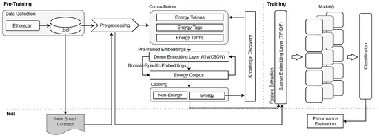 To evaluate the grammatical, symbolic, and arithmetic characteristics of smart contracts, this study analyzes their source codes using machine learning algorithms. They are deployed as predictive models for detecting Ethereum energy smart contracts. As depicted in Figure 2, the proposed classification pipeline can be deconstructed into tree main stages of pre-training, training, and testing. Pre-training encompasses data collection and feature engineering. This adheres to the embedding layer and baseline models under training, after which the models are tested and evaluated. Logistic regression (LR), naive Bayes (NB), and Support Vector Machine (SVM) are employed as classifiers and a comparative performance analysis is carried out on the obtained results. As shown in Figure 2, pre-training embeddings and domain-specific embeddings form the corpus. Its components are further illustrated in the form of the ontology shown in Figure 3 and the embeddings listed in Table 1, which can be interpreted in terms of their relative frequency (see Section 5 for an example).