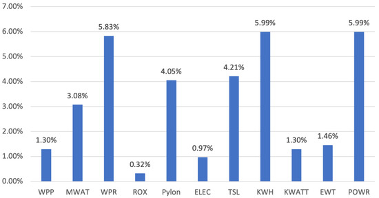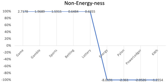Table 2 and Table 3 demonstrate how each model performs on energy and non-energy contracts independently, as well as the overall accuracy of each algorithm using precision, recall, and the F1-score [51]. The obtained results show that LR produced the maximum accuracy of 98.34%, 97.53% precision, 98.78% recall, and 98.12% F1-score. Figure 4 depicts the LRs effective energy assessment of the frequently encountered terms in the source codes. The model is fed the TF-IDF features and their corresponding coefficients, which translate to a weighted combination of input features. This is to determine the importance of the feature in the overall logloss calculation. Hence, the probability of the contract being a non-energy contract increases as the logloss increases, while the probability of the contract being an energy contract increases as the logloss decreases. As a result, the term “Energy” has been appointed a −8.0191 correlation score with non-energy terms and is regarded as the most energy-related term. Pylon [52], which has been further identified as one of the dominant energy tokens adopted in several energy transactions, has been classified as an energy-related term with a −2.361 correlation score with respect to non-energy terms. On the other hand, terms such as game, gamble, sport, betting, and lottery that embody dominant application areas for smart contracts are classified as non-energy terms [11].