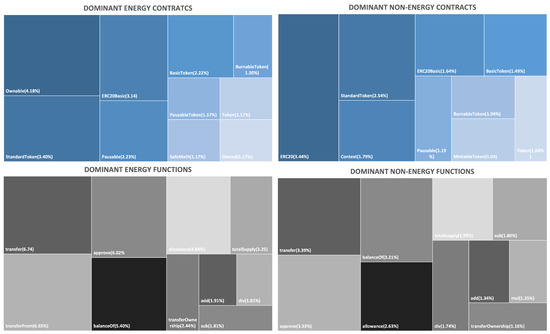 Finally, potential discrepancies between the code segments of both categories were examined, selecting 20 energy smart contracts and 20 non-energy smart contracts. Figure 6 illustrates the comparative results obtained from the distribution of contract code segments. When compared to non-energy smart contracts, the results obtained on the distribution of energy code segments imply that the development of energy contracts tends to prioritize the adoption of contracts and libraries over interfaces. The number of logical code lines (excluding comments and empty lines (LLOC)), the number of source code lines (SLOC), the number of functions (NF), the deepest nesting level (NL), the number of parameters (PAR), and the number of comment lines (CLOC) results also validate the prevalent use of identical contracts with minor adjustments and demonstrate how the lines of comments are heterogeneous and not necessarily proportionate to the length of the code. The results further confirm the prominent adoption of StandardToken and ERC20 in both classes upon analyzing dominant contract names and function names across both energy and non-energy smart contracts. As illustrated in Figure 7, the primary differences between the two classes in terms of function names can be attributed to the Ownable, Safemath, Pausable, and Mintable contracts. This indicates that Mintable contracts are not commonly used in energy contract development, since Mintable tokens feature a non-fixed total supply, allowing the token issuer to mint additional tokens. On the other hand, Ownable, Safemath, and Pausable are not identified as dominant non-energy contracts. Owanble contracts may be utilized for lowering gas costs and binding configuration functions to specific external addresses and are widely adopted in the energy sector. The SafeMath library examines whether an arithmetic operation will result in an integer overflow/underflow. Energy contracts use Safemath to send an exception and rollback the transaction. Pausable contracts are another common practice among energy contracts, allowing the owner of a Pausable contract to halt and restart functions. The owner can pause the functionality at any time; thus, users may be hesitant to utilize the corresponding dApp, making this a drawback in design for energy contracts. Although from a vulnerability analysis standpoint, the lack of a pause mechanism requires vulnerable contracts to be aborted while an alternate instance becomes available on the blockchain. Finally, the same analysis among functions in both classes entails the adoption of comparable functions across each category, with more prevalent adoption among energy contracts, as illustrated in Figure 7.