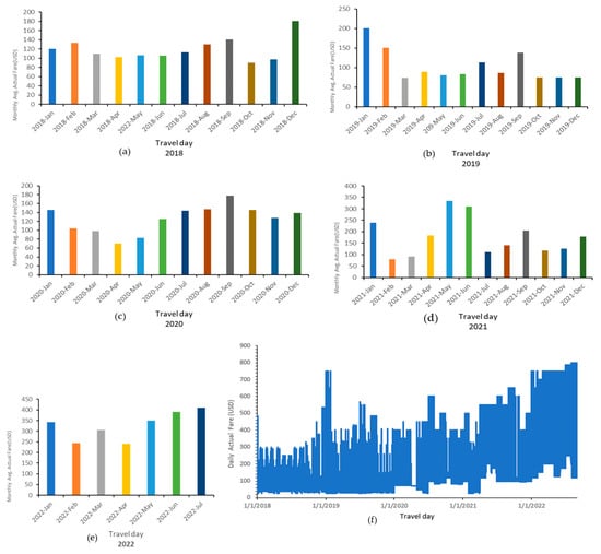 Data visualization is essential for interpreting complex datasets, allowing users to make sense of a large amount of information quickly and efficiently [,]. The data ranged from January 2018 to July 2022, and there were more than 1,000,000 records from 22 domestic and international airline destinations. As we dove into analyzing this vast dataset, it became crucial to present the findings in an easily interpretable way so as to bring about the insights intuitively. We employed data visualization techniques to reveal patterns, trends, and correlations that would otherwise have been challenging to discern. Figure 1 shows the relationship between travel dates and flight ticket fares (in USD), with six subfigures depicting different aspects of the data. Figure 1a–e display the monthly averages of flight ticket fares for the year 2018 through the year 2022 (up to July), which reveal information regarding price changes over time. Figure 1f further presents a more granular view of the data that depicts the daily fares of flight tickets for the entire dataset. Collectively, these subfigures give an overview of trends and fluctuations concerning prices for the whole dataset.