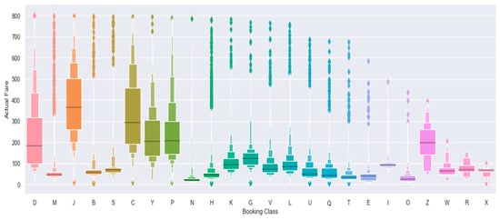 Additionally, Figure 2 presents a boxenplot of flight fares versus booking classes. The boxenplot is a commonly used statistical tool that displays the distribution of a dataset and highlights such key features as the median, quartiles, and outliers. Unlike a traditional boxplot, the boxenplot divides the data into smaller subgroups, allowing for a more detailed view of the distribution. In this case, we used the boxenplot to examine the relationship between the flight fare and the booking class, which is the letter code used by the airline to identify the fare type and restrictions of a ticket. By analyzing the boxenplot, we were able to identify the ranges of ticket fares as well as the potential outliers or anomalies that might have an impact on our analysis. This initial exploration served as a foundation for our subsequent pilot analysis, allowing us to better understand the data beforehand. Furthermore, the correlations between the features were computed, and a few of them are selected and displayed in Table 3. As can be observed from Table 3, some features, such as Holiday, Week Day, Seg_Dest, and Class of Service, are highly correlated to the Actual Fare. The preliminary data analysis, consisting of descriptive statistics and correlation techniques, has provided valuable insights into the key factors that impact flight ticket prices. These insights were instrumental in the development of an accurate prediction model.