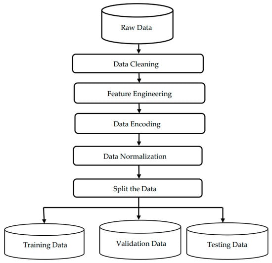 To improve the quality of the data, data preprocessing techniques were applied to the raw data collected from the sources. Figure 3 shows the overall data processing stages. Some errors in the raw data were first corrected in the data cleaning stage, and feature engineering was then conducted. Feature engineering involves creating new features from existing data fields to enable the model to better capture underlying patterns within data. Based on the data analysis in the previous section, a few new features, including Season, Travel Day, Travel Month, IsWeekend (Yes/No), IsHoliday (Yes/No), and NumOfStops, etc., were created, as listed in Table 4. These features exhibit specific characteristics of the flight data that influence ticket fares and are meaningful for business decisions. For instance, Season and Travel Month might indicate long-term seasonal demand for flights, while IsWeekend could help to identify the price difference between weekends and weekdays. Similarly, IsHoliday can be used to analyze whether or not prices change during holidays. The feature NumOfStops may be helpful for differentiating prices between direct and connecting flights. Overall, those features provide a comprehensive view of flight data and help build a more reliable prediction model since they are correlated to flight ticket fares.