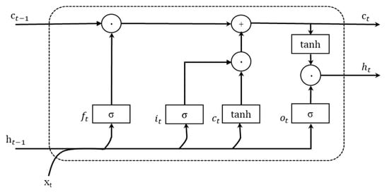 Long short-term memory (LSTM) is a type of recurrent neural network with a deep architecture [,]. Its unique gate mechanism and structure significantly enhance the model’s memory capacity and alleviate the problem of gradient disappearance that is often encountered when training classical RNNs on very long input sequences []. Figure 4 depicts the network layout of one neural unit of LSTM. The LSTM neural network is composed of several gates and variables. The input gate, , regulates how much new information is added to the cell state at each time step. The forgetting gate,, determines how much information from the previous cell state should be retained. The output gate, , regulates how much information should be output from the current cell state. The input channel state, , is obtained by compressing the messages from the input state, , and the previous hidden state, , with the tanh function, and might be added to the cell state, under the control of the input gate . The cell state denotes the long-term memory in general that could be forgotten through the forgetting gate, .