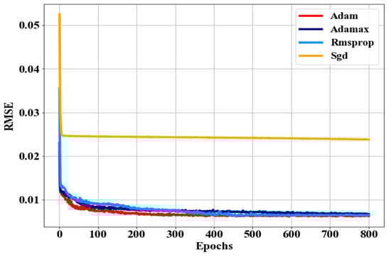 The performance of the proposed GRU model was compared with that of the MLP and LSTM. During the training process, a number of parameters, such as batch size, activation function, number of hidden units, type of optimizer, and number of epochs, were adjusted until the best possible model was obtained. Four optimizers, including Adam, Adamax, RmsProp, and Sgd, were tested to minimize the loss. The losses with respect to the number of epochs for the four optimizers are compared in Figure 8. It can be observed from Figure 8 that the Adam optimizer converged much faster than the other three. Therefore, the Adam optimizer was adopted to train the models in the following experiments.