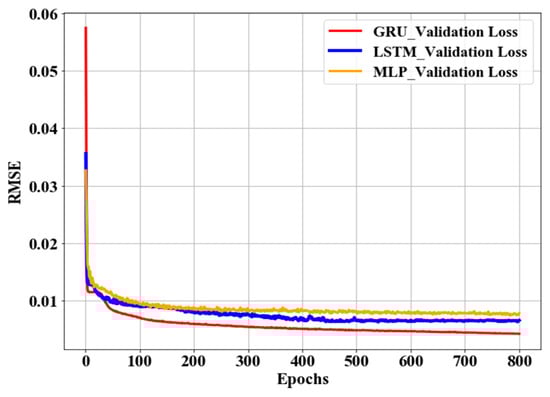 Figure 9 depicts a comparison of the convergence speed of the GRU, LSTM, and MLP models. As can be observed from Figure 9, the GRU model outperformed the others in RMSE. The loss of the GRU model was significantly lower than that of the others.