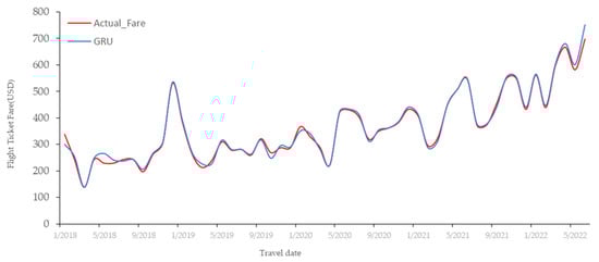 Furthermore, the experimental results of two popular machine learning approaches, autoregressive integrated moving average (ARIMA) and support vector regression (SVR), are listed in Table 6 for comparison. ARIMA is a combination of the autoregressive model, which captures the dependency of the current observation output on the previous observations, and the moving average model, which captures the dependency on the current and previous inputs. The ARIMA model can be characterized as ARIMA (p, d, q), where p is the degree of autoregression, d is the degree of differencing, and q is the degree of moving average. In this study, we utilized the setting of ARIMA (5, 1, 1) to forecast future prices. In addition, for SVR, the kernel was set as a radial basis function (RBF). It can be observed from Table 6 that the GRU model stands out as a clear choice in fare prediction, providing the airline transport industry with a trustworthy reference.