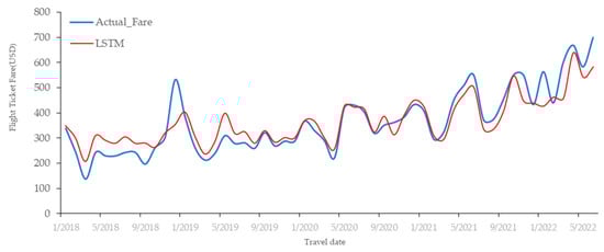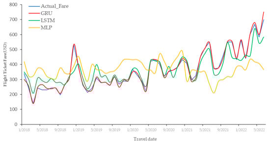 Furthermore, the average of the predicted ticket fares for one flight based on the three different prediction models, GRU, LSTM, and MLP, were compared with the average of the actual fares in Table 7. The results in Table 7 indicate that the average of the predicted ticket fares for GRU is much closer to the actual average fares than those for LSTM and MLP. This suggests that GRU is a more accurate model for predicting ticket fares. Overall, the above results provide evidence of the superiority of the GRU model in predicting flight ticket fares and suggest that it is a promising approach for further study in this field.