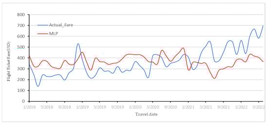 Figure 10, Figure 11, Figure 12 and Figure 13 further show the predicted and actual fares of all the flights for GRU, LSTM, MLP, and all three models, respectively, based on monthly averages. As can be observed from these figures, the predicted values by GRU were much closer to the actual values, as indicated by the lower absolute differences between the predicted and actual values. Given the extensive periods covered by historical flight prices, i.e., the four years and seven months in our dataset, the GRU model’s capabilities make it an appropriate choice for the fare prediction of flight tickets.