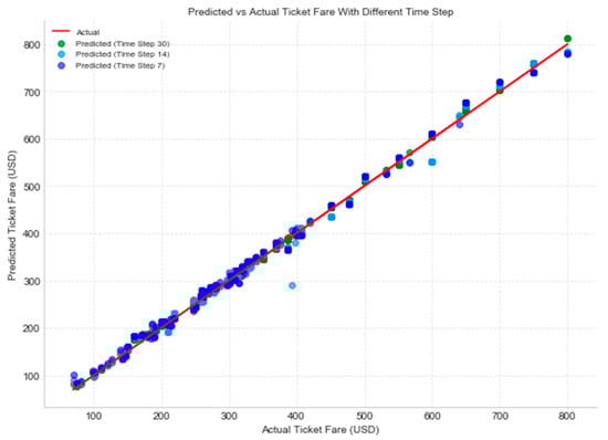 In addition, we conducted additional experiments with different prediction horizons to provide a comprehensive analysis of the model’s performance over varying timeframes. These experiments aimed to capture short-, medium-, and long-term forecasting scenarios. We evaluated the accuracy of the GRU model using three different prediction horizons; the time steps of 7, 14, and 30, and the experimental results are displayed in Figure 14. It can be observed from Figure 14 that the variations in the predicted outcomes for different prediction horizons were low, which demonstrates the robustness of the GRU model and provides valuable insights into the predictive capabilities of the model across different forecast periods.