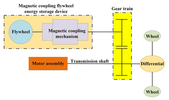 The magnetic coupling flywheel energy storage device fully considers the limited space inside the vehicle, adopts the compact design concept, and realizes the advantages of simple structure as well as convenient disassembly and maintenance. Using the magnetic effect, without any external energy, the device belongs to a kind of green energy-saving environmental protection equipment [22]. The schematic diagram of the layout is shown in Figure 1.