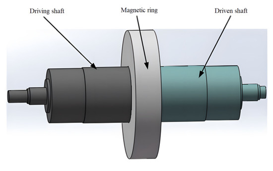 The magnetic coupling mechanism is the core component of the device; it is mainly composed of three parts: driving shaft, driven shaft, and magnetic ring. The structure is shown in Figure 2.