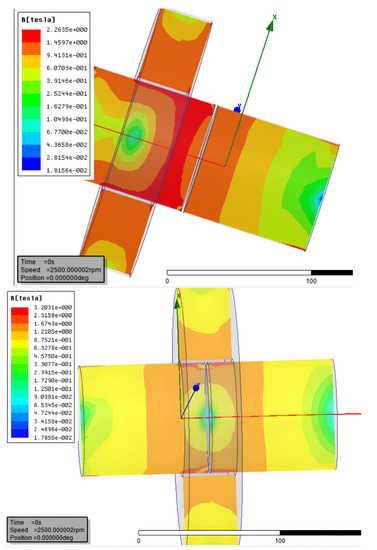 We used Ansys Maxwell to simulate the separation state and combination state of the magnetic coupling flywheel energy storage device, as shown in Figure 4.