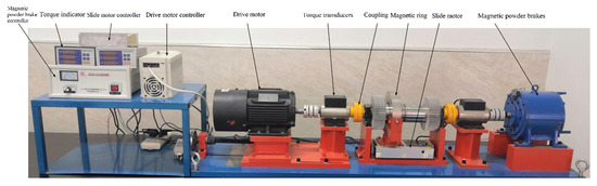 The test platform of the magnetic coupling mechanism is built as shown in Figure 5. The platform provides the corresponding driving torque and load through the drive motor and the magnetic powder brakes, respectively, and changes the magnitude of the driving torque and load by the drive motor controller and the magnetic powder brake controller, so as to test different working conditions. Through the slide motor controller, the magnetic ring moves under the action of the slide motor, so that the driven and driving shafts are separated and coupled, thereby changing the torque transmission relationship of the driven and driving shafts.