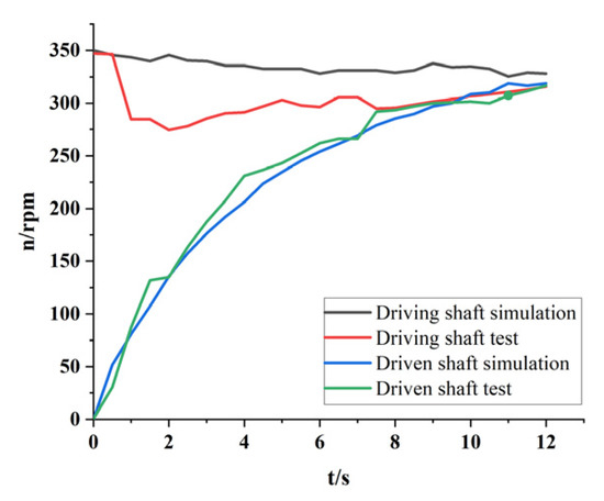 As shown in Figure 6, we adjusted the speed of the driving shaft to 350 r/min for testing the transmission relationship of the driving and driven shafts.
