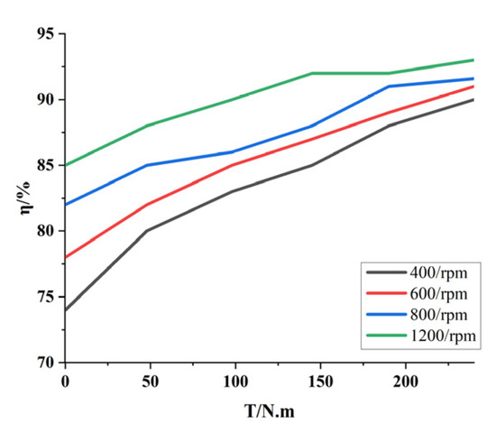 As shown in Figure 8, we adjusted the driving shaft at four rotational speeds of 400 rpm, 600 rpm, 800 rpm and 1200 rpm to obtain different transmission torques through axial movement and tested the operating efficiency under the corresponding working conditions.