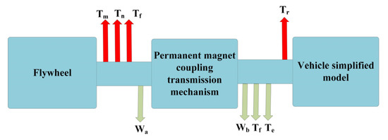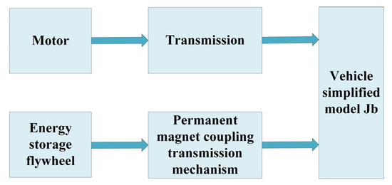 The vehicle dynamics model with the magnetic coupling flywheel energy storage device is simplified to obtain an equivalent dynamic model, as shown in Figure 9. The main reducer and the gear train are simplified to the driven half shaft in the magnetic coupling mechanism, and a simplified model with the equivalent moment of inertia Jb is obtained. According to the states of the magnetic coupling mechanism of the car under different driving conditions, the relevant mechanical equations are derived from the three stages of starting, braking and acceleration for the equivalent model, and the mechanical analysis is carried out to obtain the energy recovery of the driving conditions.