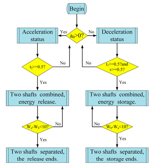 When the acceleration is equal to 0, the duration is greater than or equal to 0.5 s, and the vehicle speed is not less than 5 m/s, the vehicle is in a deceleration state. At this time, the magnetic ring moves to the right and the two shafts are combined, and the flywheel stores energy. When the angular velocities of the two shafts are equal, the magnetic ring moves to the left, the two shafts are separated, and the energy storage ends. When the acceleration is greater than 0 and the duration is greater than 0.5 s, the vehicle is in an accelerated state, the magnetic ring moves to the left, the two shafts are combined, and the flywheel releases energy. When the angular velocities of the two shafts are equal, the magnetic ring moves to the left, the two shafts are separated, and the energy release ends. When the difference in angular velocity between the two shafts is less than 10 rad/s, the two shafts are synchronized (Figure 13).
