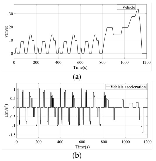 The recovery effect of braking energy is affected by many aspects, including the initial speed of the vehicle when braking, vehicle acceleration, and the duration of vehicle acceleration and deceleration. In this paper, the NEDC cycle condition (Figure 14) is selected for the objective evaluation of the braking energy recovery effect [28].